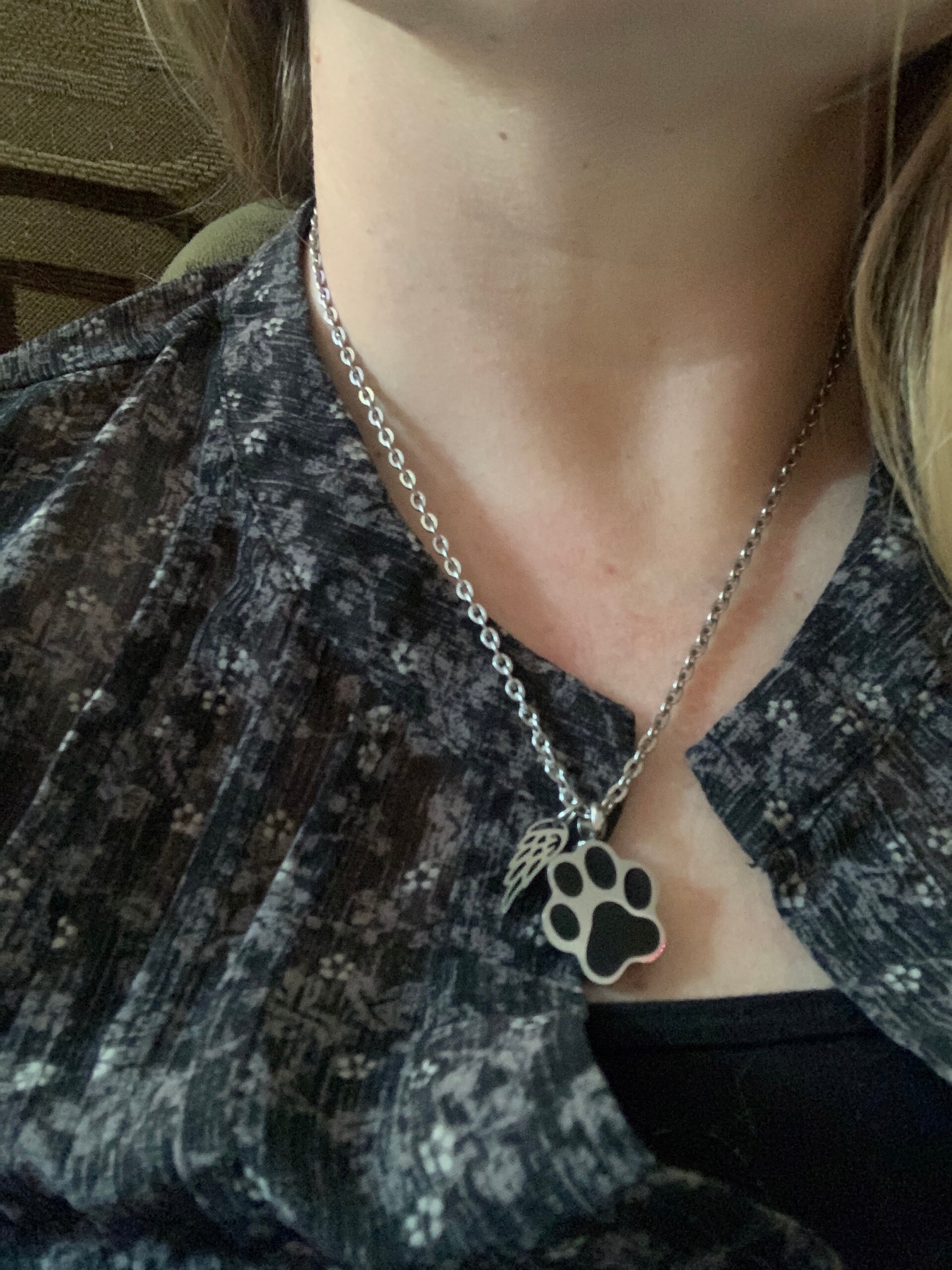 This is my second time purchasing this necklace. it’s just as wonderful as the first. it’s high quality and looks wonderful. i will say after wearing the first necklace for 5 years the black paw prints do fall out but it nothing a little superglue can’t fix!